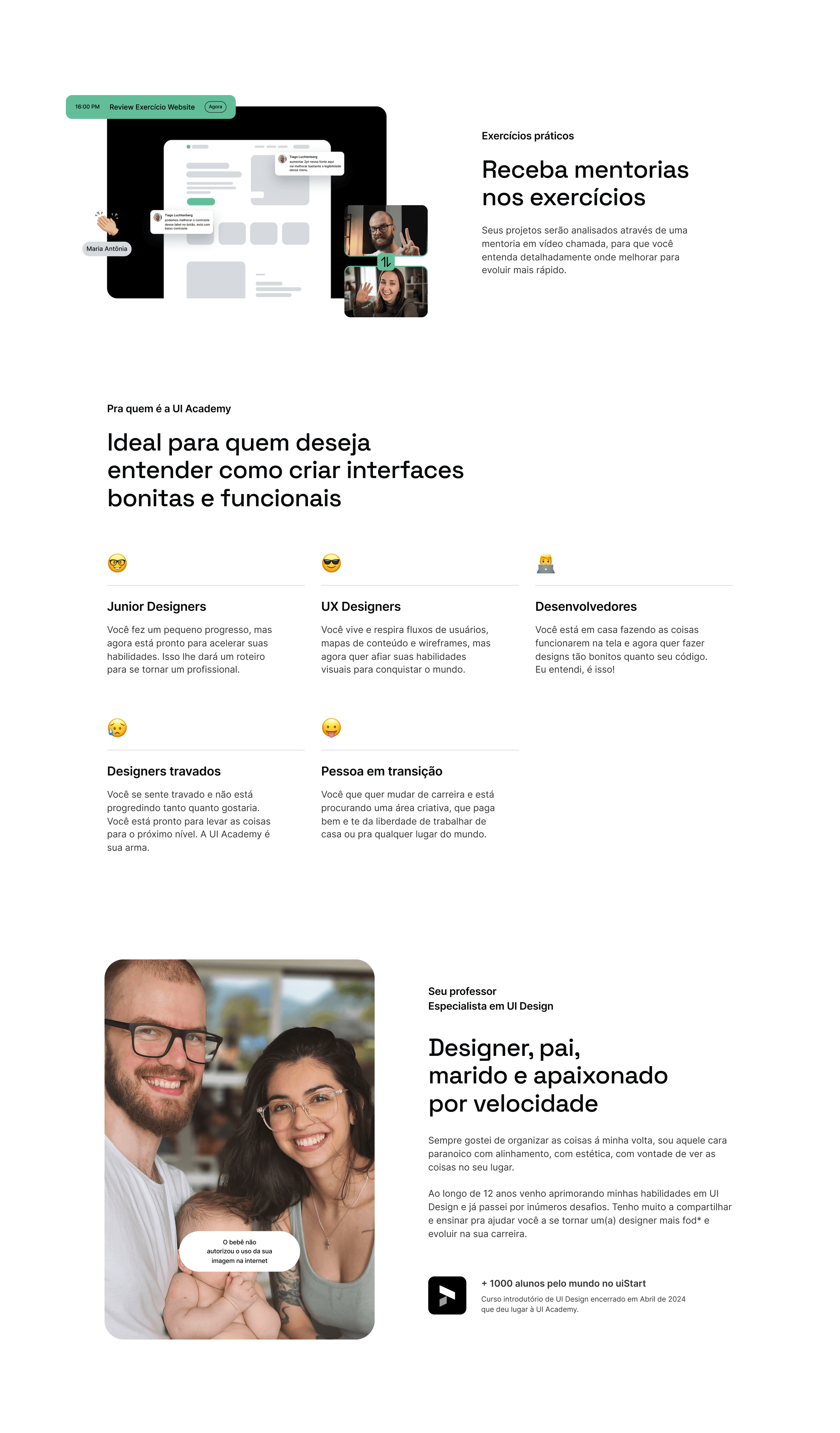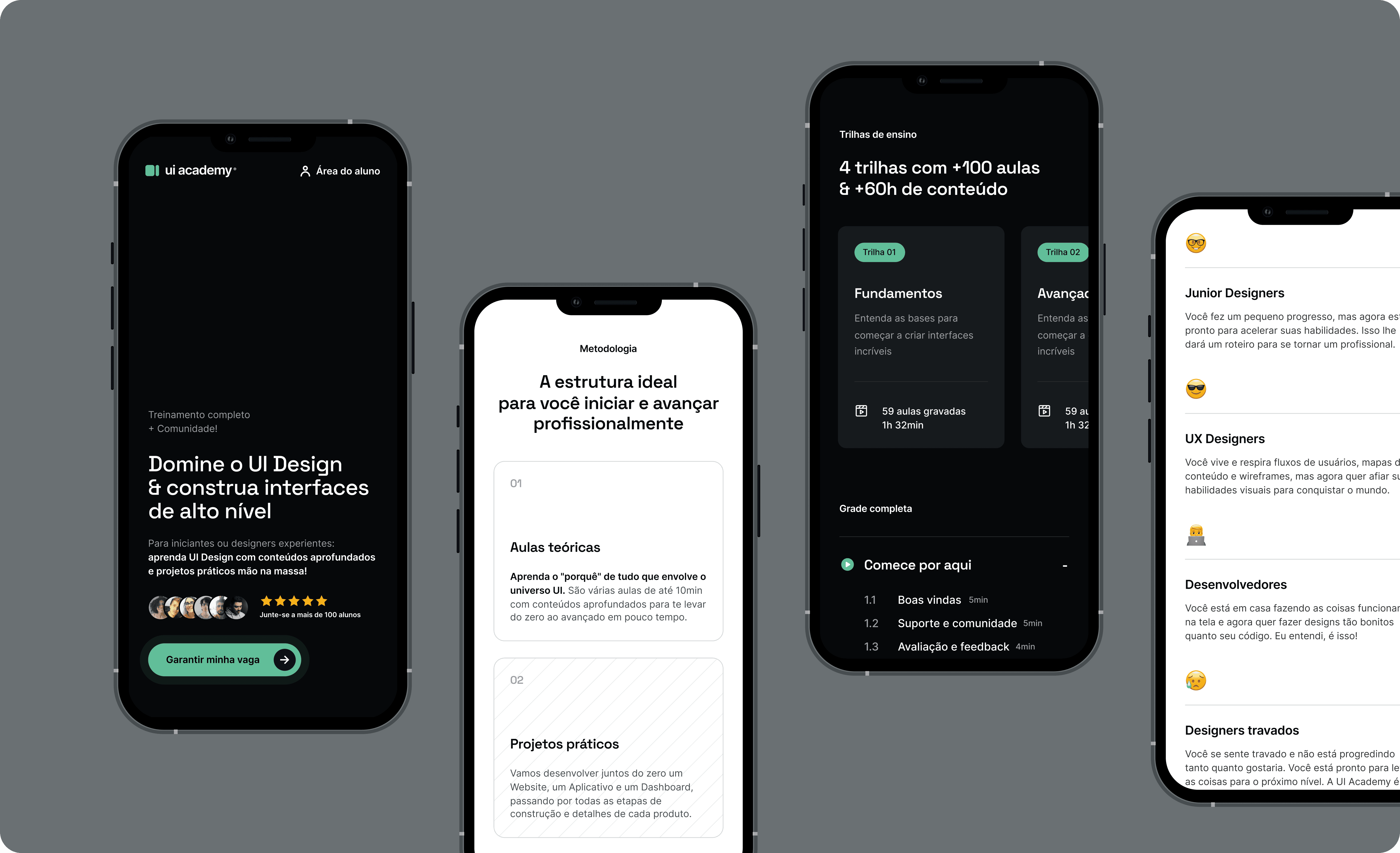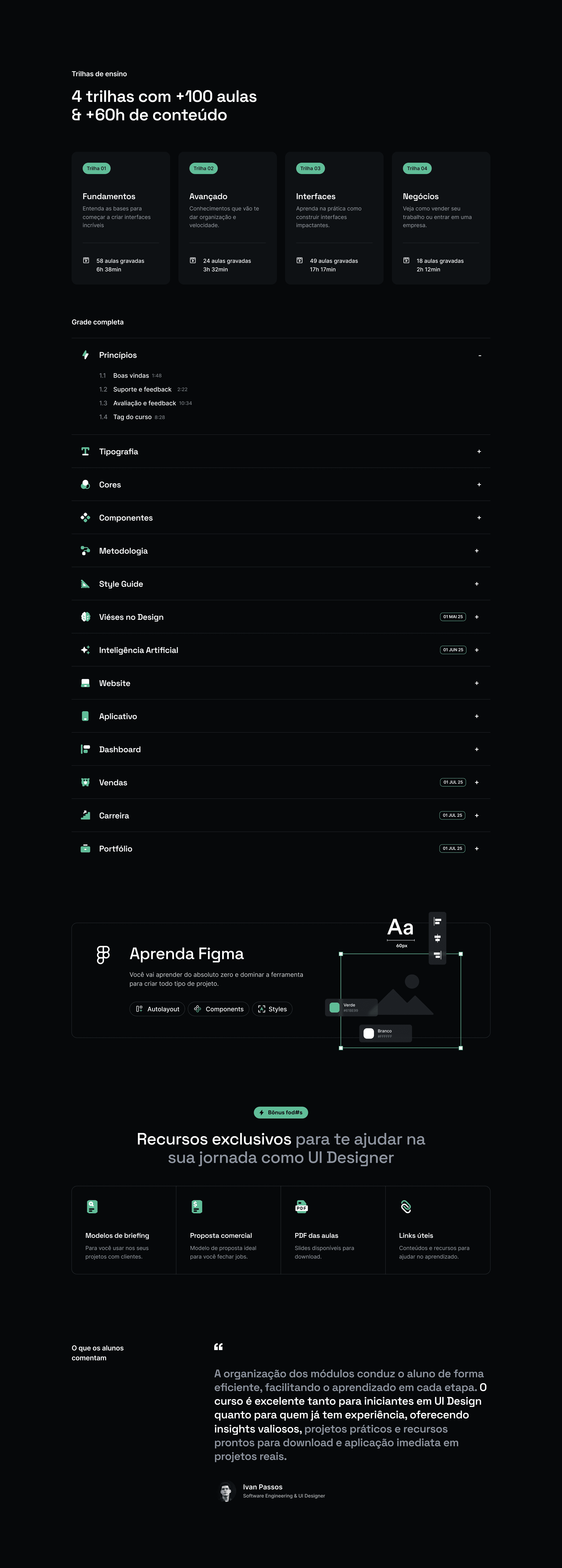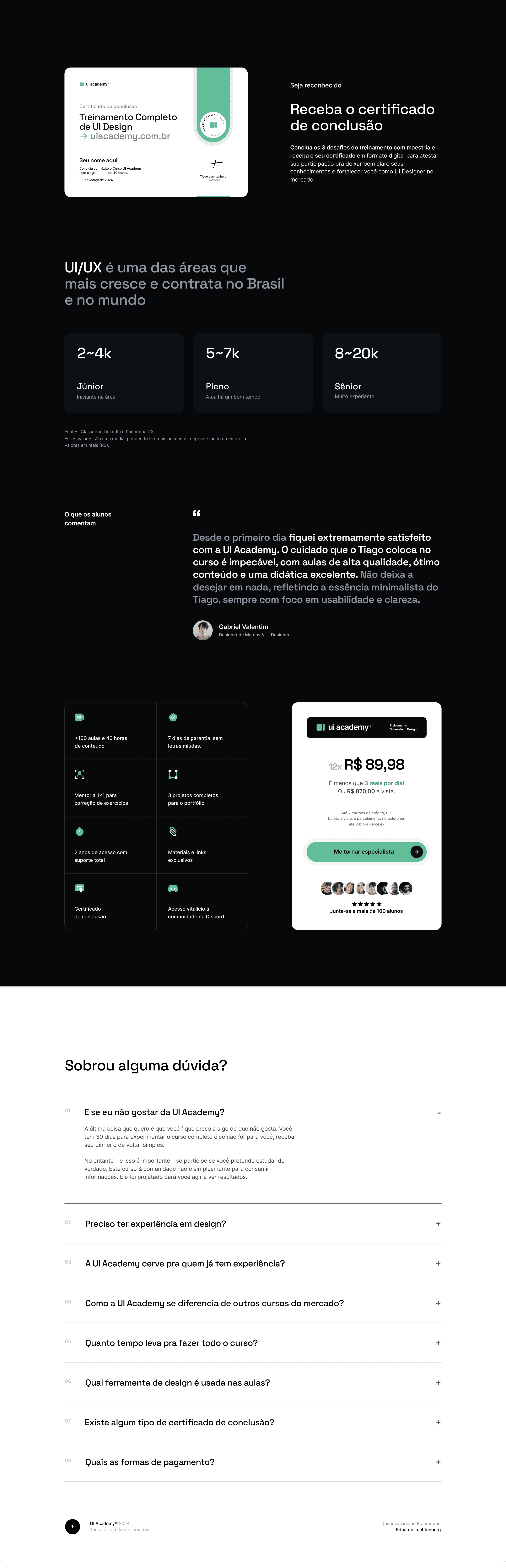 Escola especializada em UI Design, com foco em ensinar de forma teórica aprofundada e prática através de projetos práticos mão na massa. A página foi criada para comunicar com clareza e modernidade, otimizando a conversão de novos alunos.
